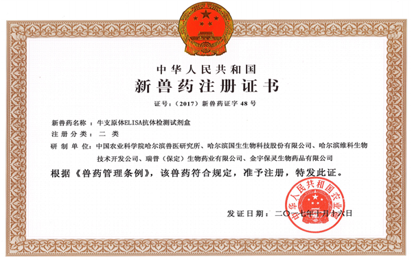 熱烈祝賀哈爾濱國(guó)生生物科技股份有限公司“牛支原體ELISA抗體檢測(cè)試劑盒”獲得新獸藥注冊(cè)證書(shū)